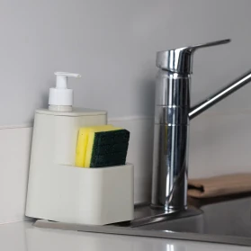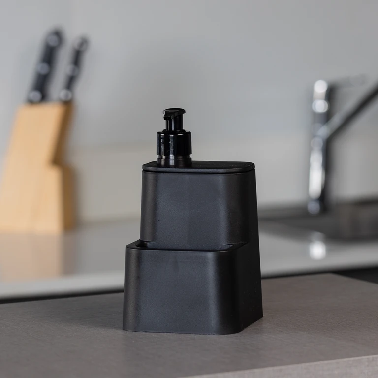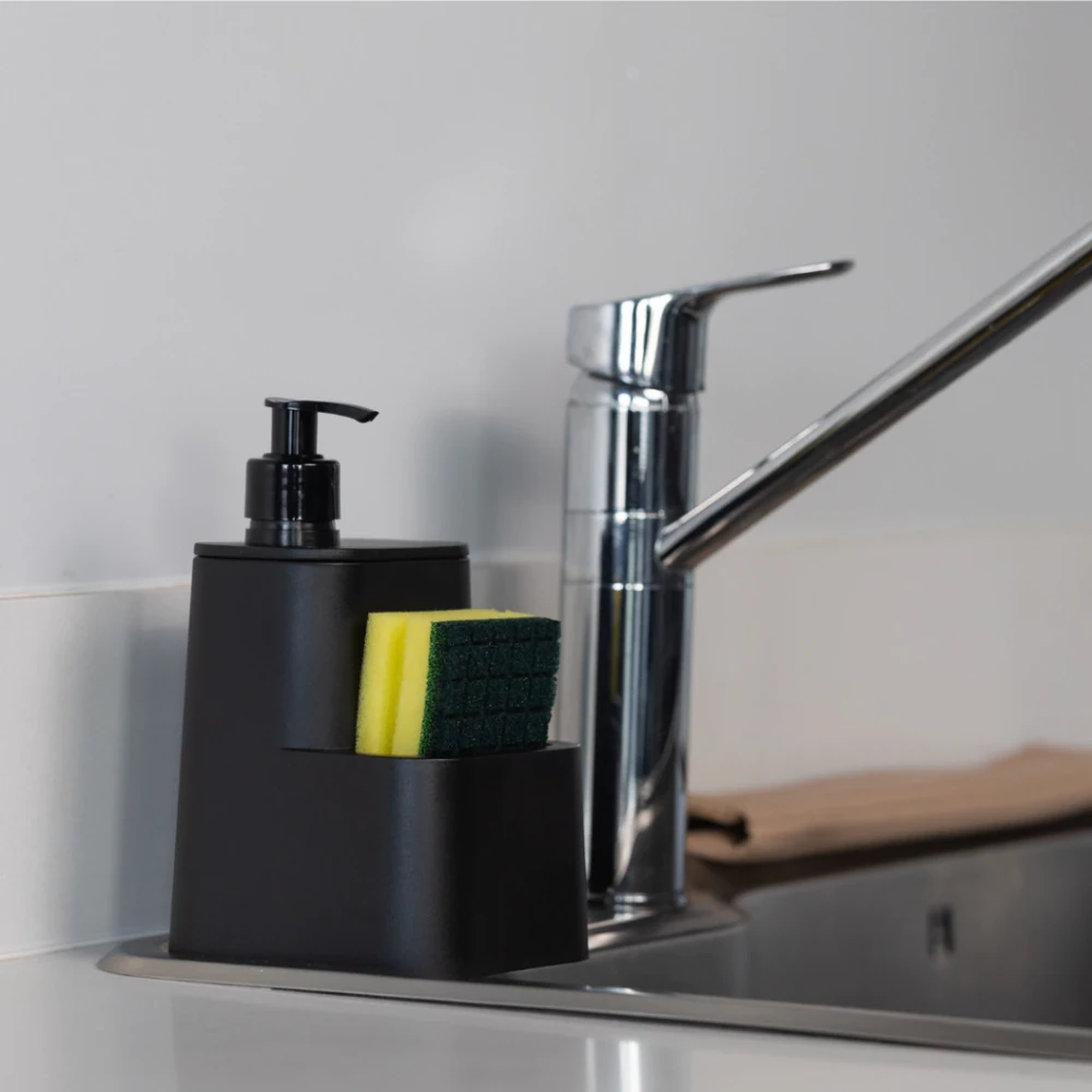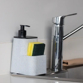 Dispenser con compartimiento para esponja Diseño funcional y ecológico 100% reciclado Asegura que la esponja se mantenga seca y lista para usar Optimiza y organiza el espacio